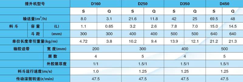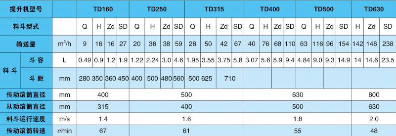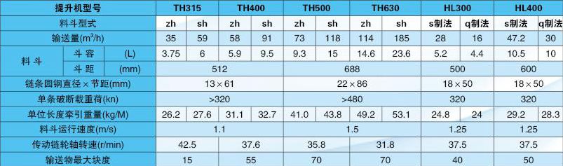 我公司生产多种型号斗式提升机,既有依靠链条牵引的TH、HL型,依靠高强度尼龙芯胶带运输牵引的TD型和有普通橡胶带牵引的D型,又有我公司新开发的依靠履带链牵引的TL型,可根据用户需要选型号。